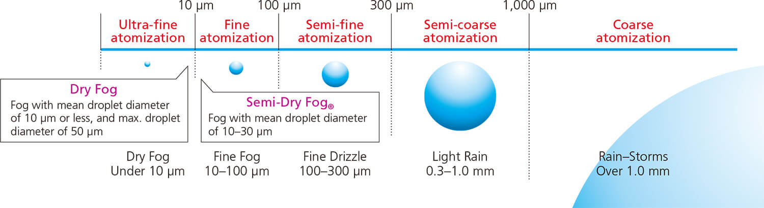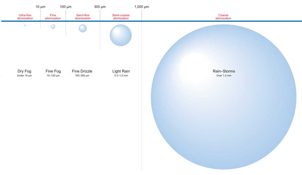 Pour être en mesure de différencier les différents types de tailles de gouttelettes de pulvérisation, une classification des tailles de gouttelettes peut aider à clarifier quel produit est adapté ou recommandé pour une application particulière. Sur la base de la classification fournie par IKEUCHI, il existe 5 types de tailles de gouttelettes :