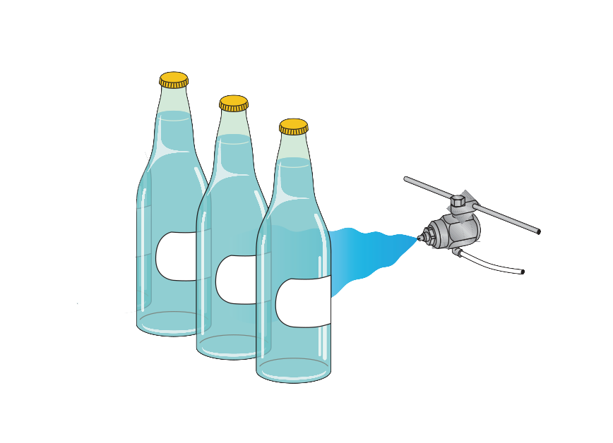 L’ajout d’une fine brume à votre processus d’étiquetage des bouteilles permet de garantir que l’étiquette adhère correctement et d’éviter les plis, les bulles ou les bavures. Nos buses de pulvérisation BIM sont adaptées à cette application grâce à leur atomisation fine avec un diamètre moyen de gouttelettes de 100 µm ou moins.