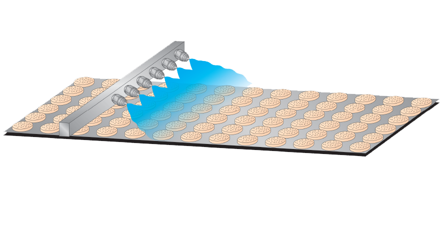 L’hydratation du pain est importante à chaque étape du processus. Le maintien d’un taux d’humidité approprié permet de préserver la fraîcheur et de prolonger la durée de conservation des produits de boulangerie. Pour améliorer la texture après la cuisson, une fine brume de moins de 50 µm peut être ajoutée afin de contrôler le taux d’humidité et l’hydratation autour du pain. Notre système de pulvérisation BIM est idéal pour cette application, car il offre une atomisation fine et peut être installé sur n’importe quel tapis roulant.