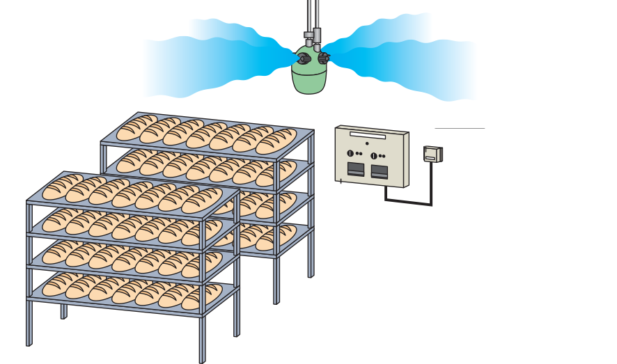 La chambre froide est désinfectée en pulvérisant de l’alcool à l’aide de buses installées dans le conduit de refroidissement. Cela permet d’empêcher la formation de moisissures et d’augmenter la sécurité du produit final. Il s’agit d’une application courante dans l’industrie boulangère.