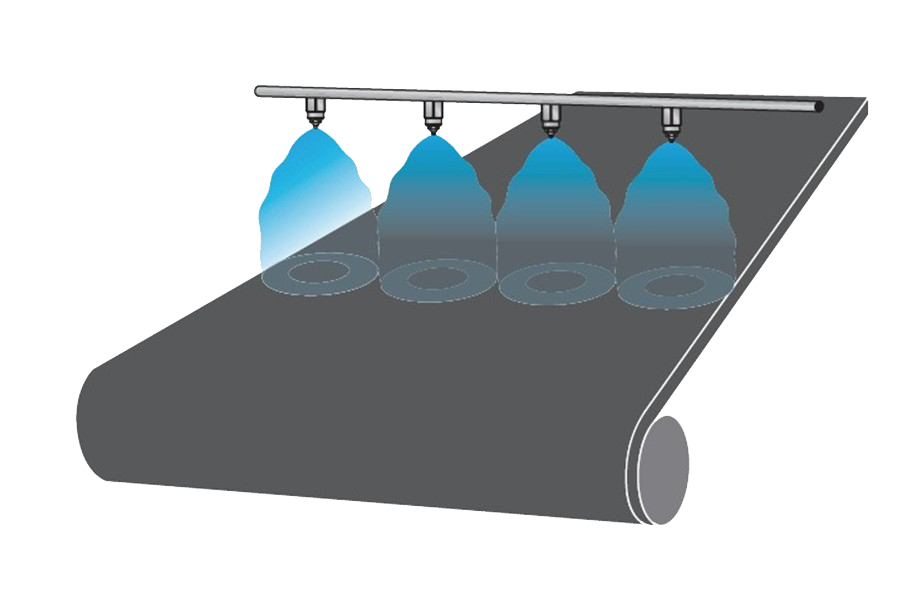 En appliquant une série de buses de pulvérisation à fine brume sur la bande transporteuse, celle-ci est efficacement désinfectée et séchée immédiatement. Les ingénieurs d’Ikeuchi peuvent vous conseiller sur les buses appropriées à votre application spécifique.